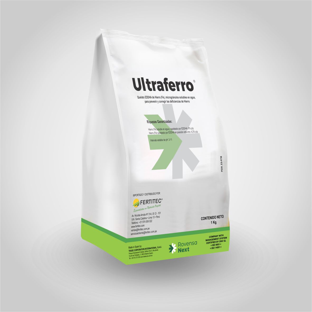 Por ello, es necesario el empleo de soluciones que permitan el transporte del hierro en forma segura hacia la planta, y una de estas soluciones es el uso de quelatos férricos como EDDHA (Ultafrerro®), que protegen al hierro y lo hacen soluble, disponible y asimilable para las plantas, con mayor eficiencia que las sales férricas, agentes complejantes u otros agentes quelantes (EDTA, DTPA, etc).